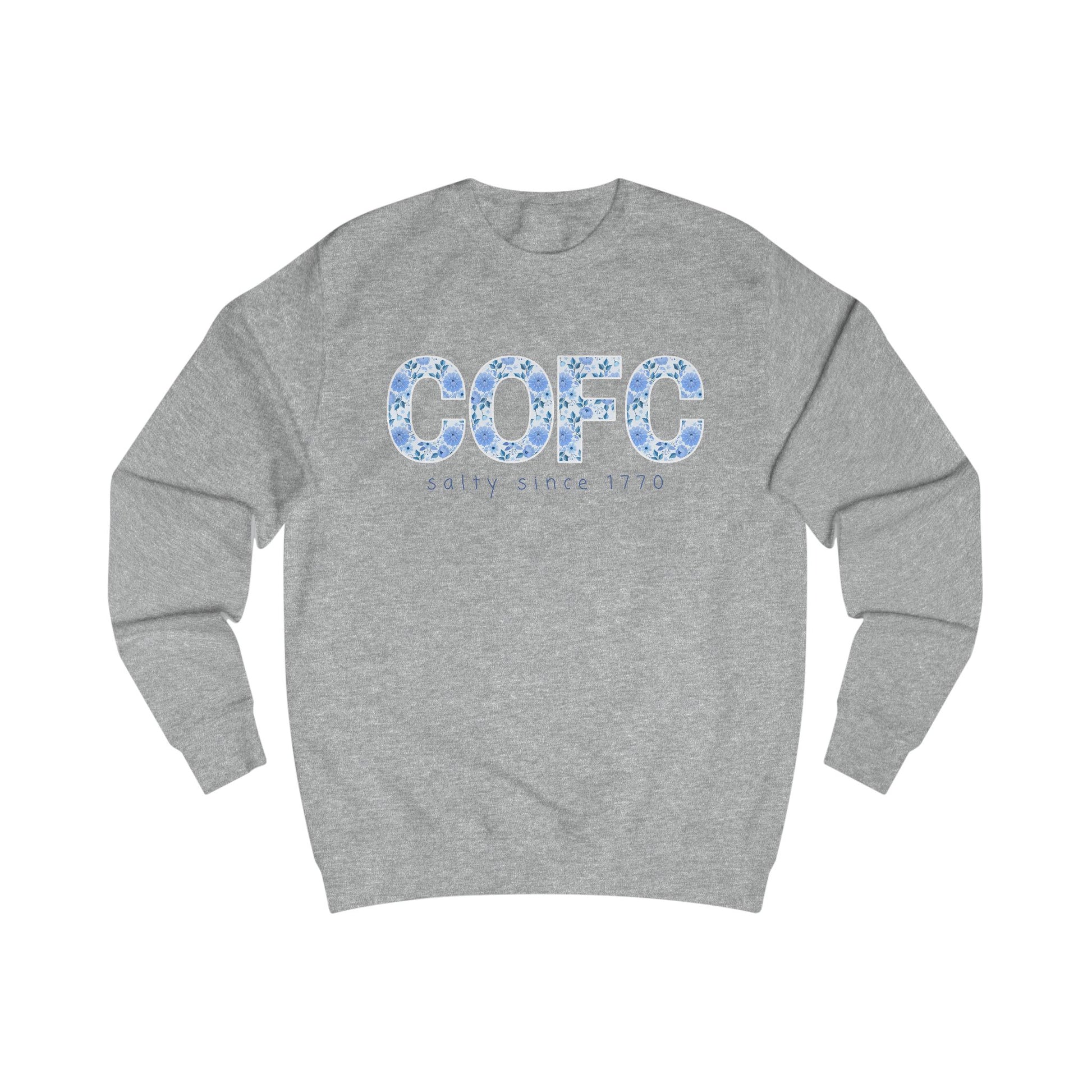 Bring a little coastal cool to your Charleston style with this dainty blue COFC crewneck. Each letter is filled with a delicate floral quilt-inspired pattern, giving a soft and feminine twist to classic college merch. Finished with our signature “Salty Since 1770” tagline in a fresh blue font, this cozy sweatshirt balances vintage charm with coastal energy.