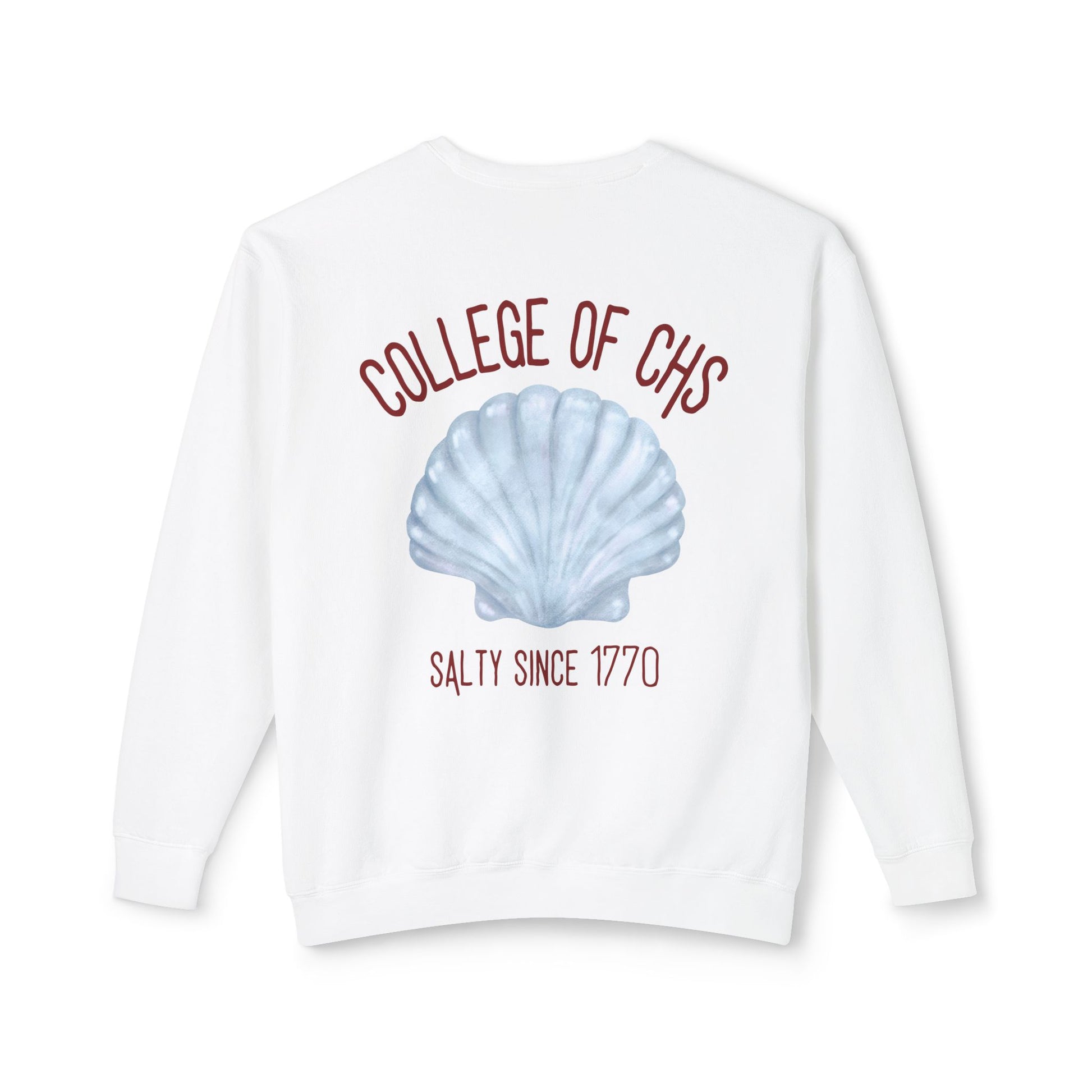 Bring Charleston charm to your everyday style with our College of CHS Seashell Sweatshirt. Designed in a soft white base, this cozy crewneck features a small watercolor seashell with “C of C” on the front chest and a bold back graphic that reads “College of CHS” with a dreamy watercolor coquette seashell. The finishing touch? A playful nod to tradition with “Salty Since 1770.”