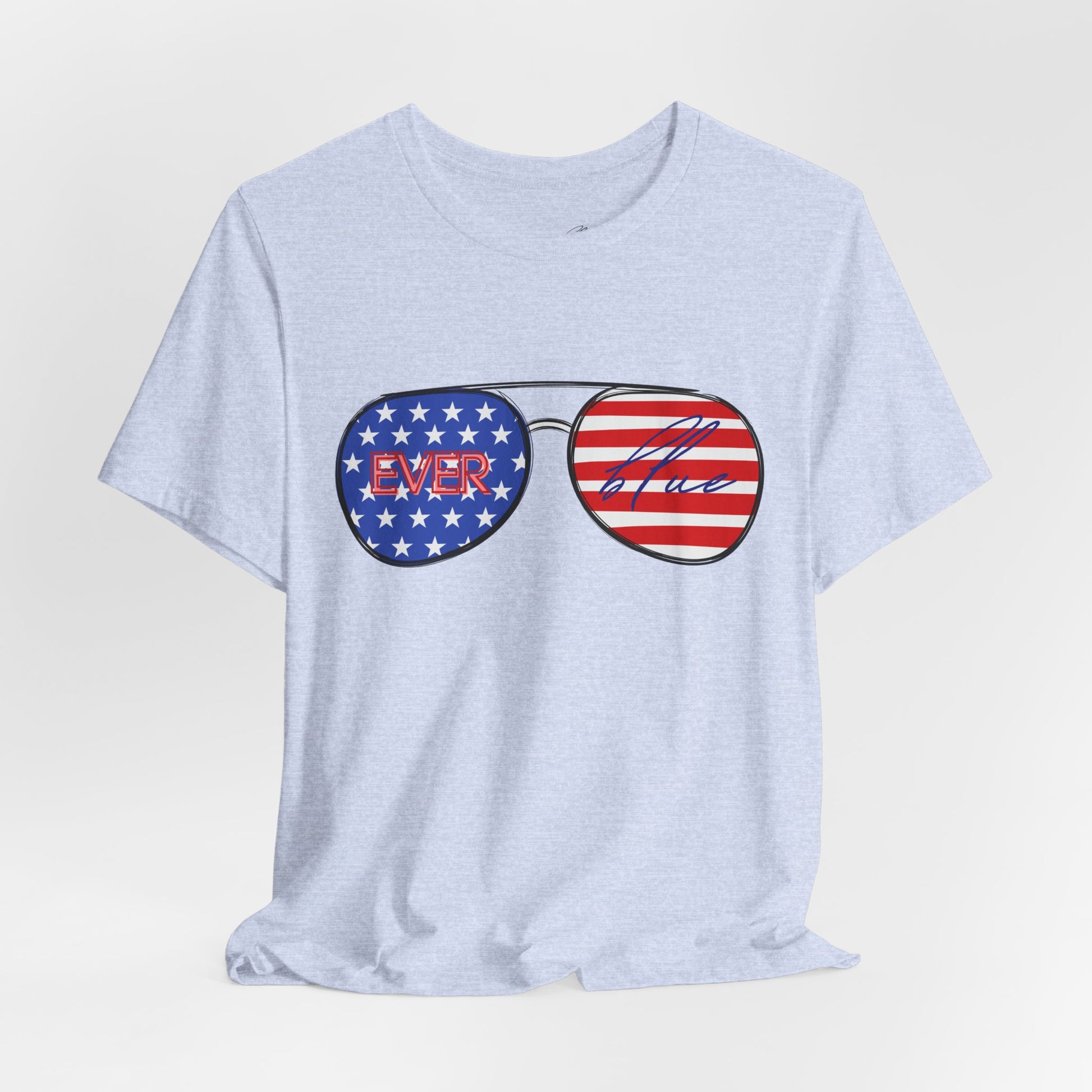 Turn heads this 4th of July with the Star-Spangled Shades Tee—a bold, effortless nod to freedom, flyovers, and fierce style. Featuring a graphic of classic aviator sunglasses filled with stars and stripes and “EverBlue” across the lenses, this tee gives off serious Maverick energy with a coastal twist.