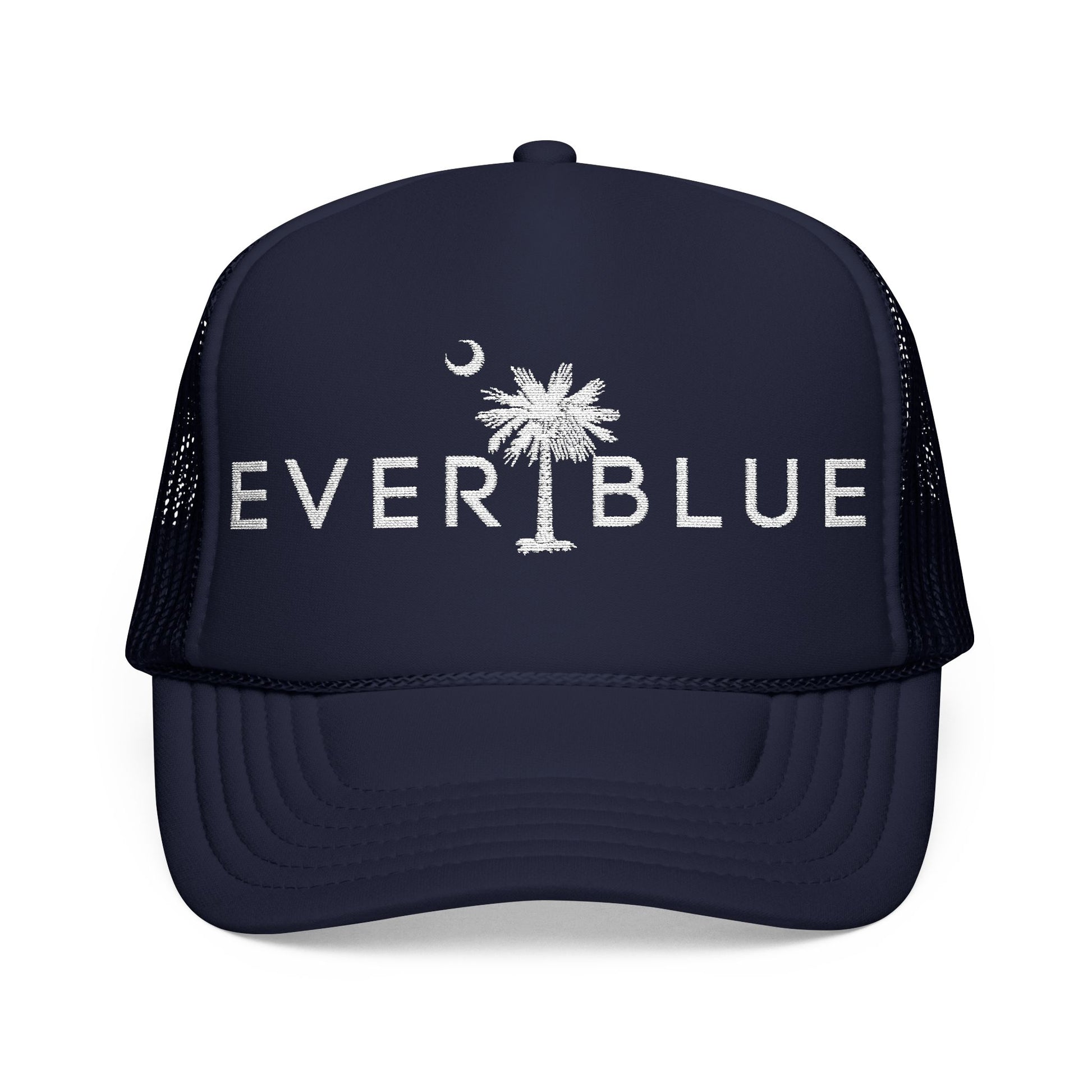Crisp, coastal, and made to go anywhere. This navy trucker hat features the Everblue logo and South Carolina emblem embroidered in classic white for a timeless, coastal look. Designed for all-season wear with breathable mesh backing and a structured fit that holds its shape.