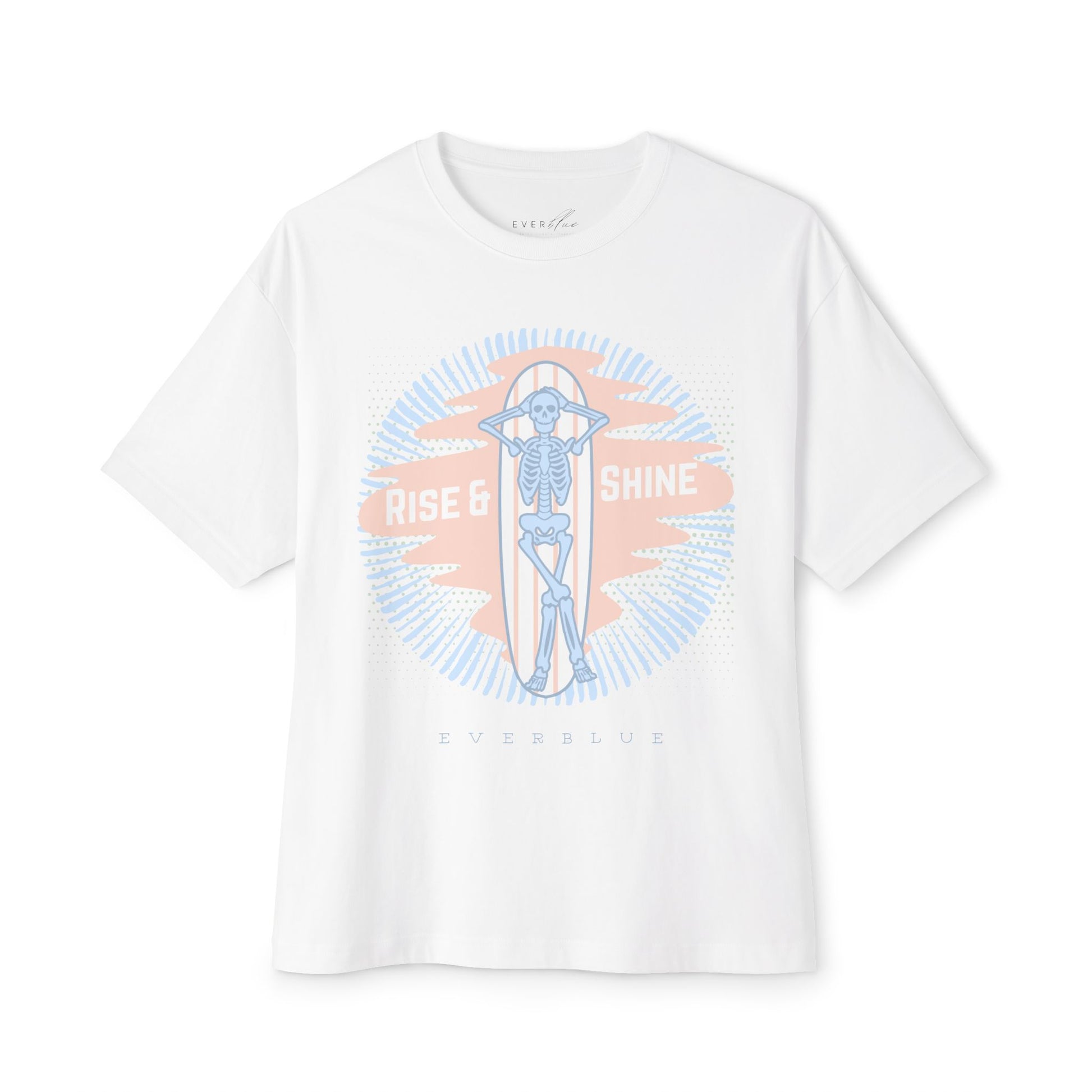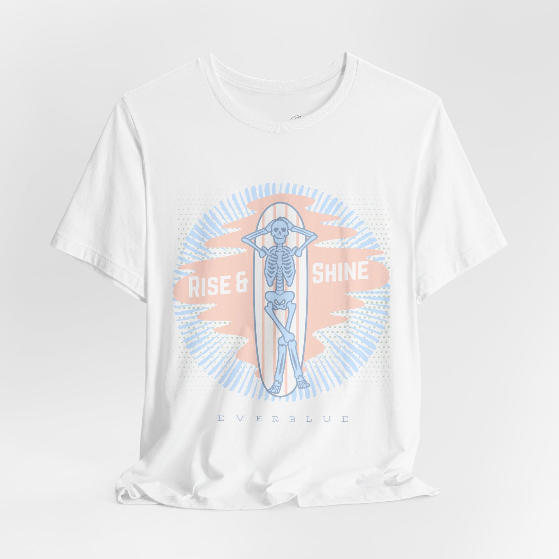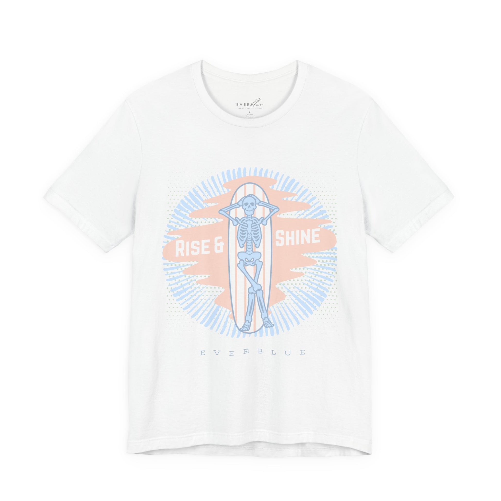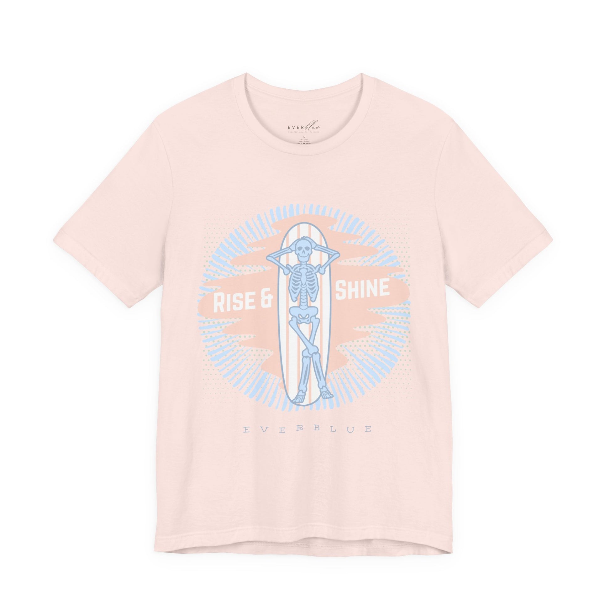 Our Rise and Shine tee flips the script on the early riser vibe — featuring a chill skeleton lounging on a surfboard, because sometimes showing up is the win. It's got that effortlessly edgy aesthetic wrapped in soft coastal tones and a feminine feel, making it the perfect mix of cute and carefree.